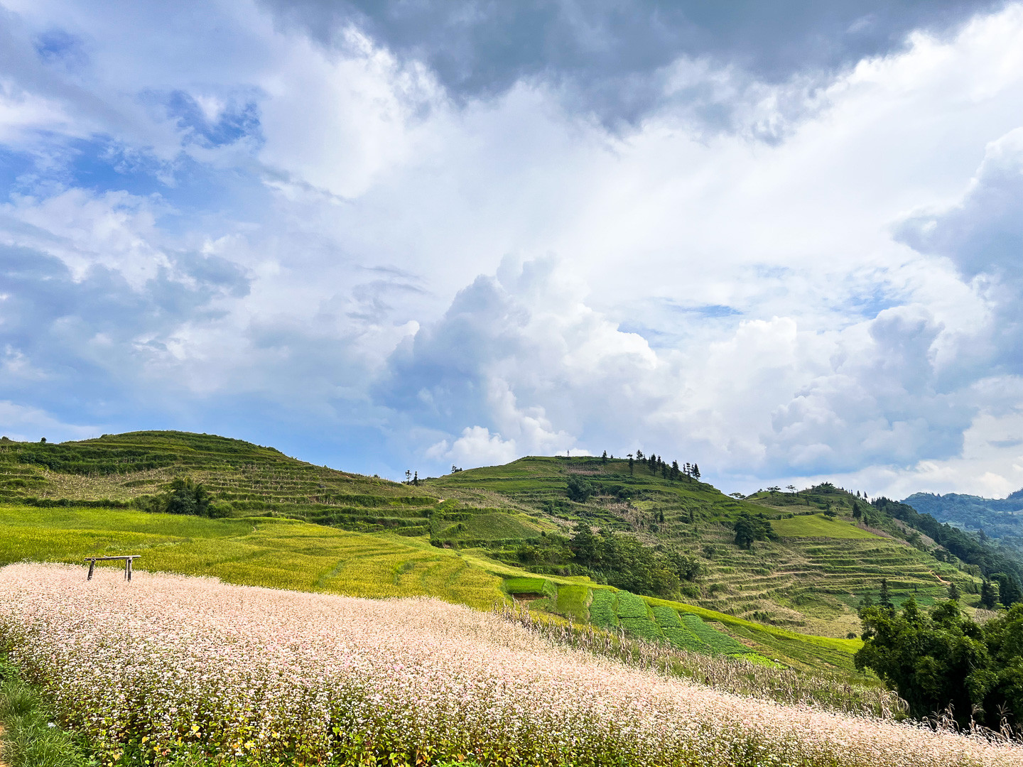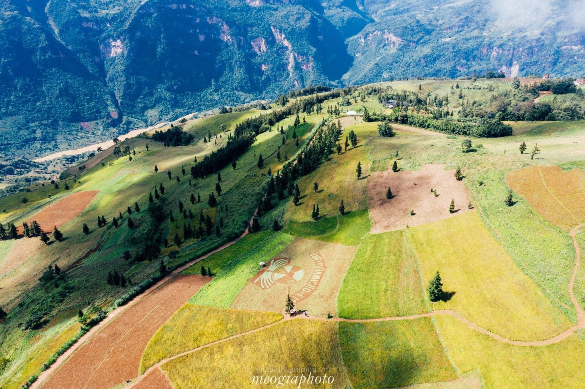 Ngoài mùa kiều mạch, thảo nguyên mang vẻ đẹp mạnh mẽ của núi đồi hùng vĩ. Dưới ánh nắng vàng rực rỡ, các dải màu từ ruộng lúa, ngô, những bụi sa mộc rải rác, cùng dòng sông Lô uốn lượn bên chân núi đã tạo nên bức tranh phong cảnh thơ mộng đặc trưng của Xín Mần.