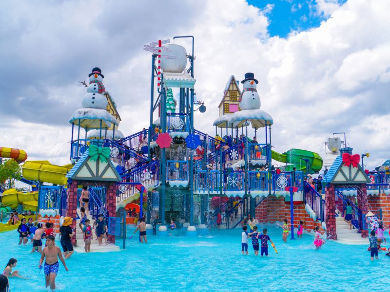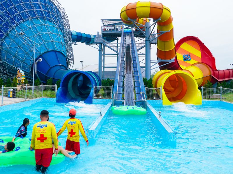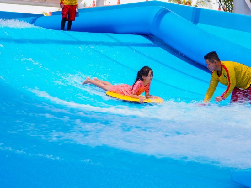 Không chỉ dừng lại ở đó, bạn còn được hòa mình vào làn nước trong xanh, thư thả dạo bước trên bờ cát mịn màng được vận chuyển từ Nha Trang — nơi nổi tiếng với những bãi biển đẹp nhất Việt Nam. Và nếu là người đam mê cảm giác mạnh, việc chinh phục những con sóng thần nhân tạo cao đến 4 mét sẽ mang lại cho bạn cảm giác phấn khích tột độ, như đang thực sự lướt sóng giữa biển khơi.