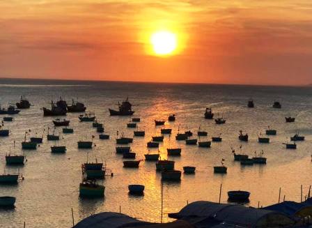 Nếu yêu thích vẻ đẹp mộc mạc và nhịp sống địa phương, làng chài Mũi Né là điểm ngắm bình minh không thể bỏ qua. Khi mặt trời vừa ló dạng, cả làng chài như bừng tỉnh với cảnh thuyền thúng, thuyền cá cập bờ, tạo nên bức tranh sinh động của đời sống miền biển.