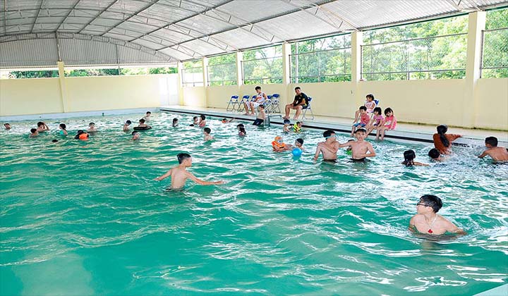 Hồ có thiết kế đơn giản nhưng sạch sẽ, không gian thoáng đãng nhờ mái che vòm cao. Đây là hồ bơi có mái che tại Sài Gòn giá rẻ bậc nhất khu vực phía Bắc thành phố, thu hút rất đông học viên đến tập luyện.
