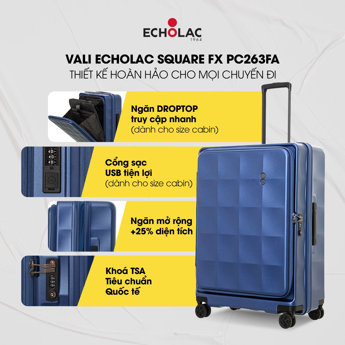 PC263 là bộ sưu tập vali mới của thương hiệu Echolac, nó là phiên bản cải tiến từ dòng vali PC183F được liệt kê ở trên. Ở dòng vali này, cổng sạc được thiết kế 2 đầu để tăng độ tương thích, linh hoạt và tiện lợi trong việc dùng nhiều thiết bị. Cả vali Echolac PC263 và PC183F đều được thiết kế theo tiêu chuẩn quốc tế về chất lượng độ bền và tính năng ứng dụng.
