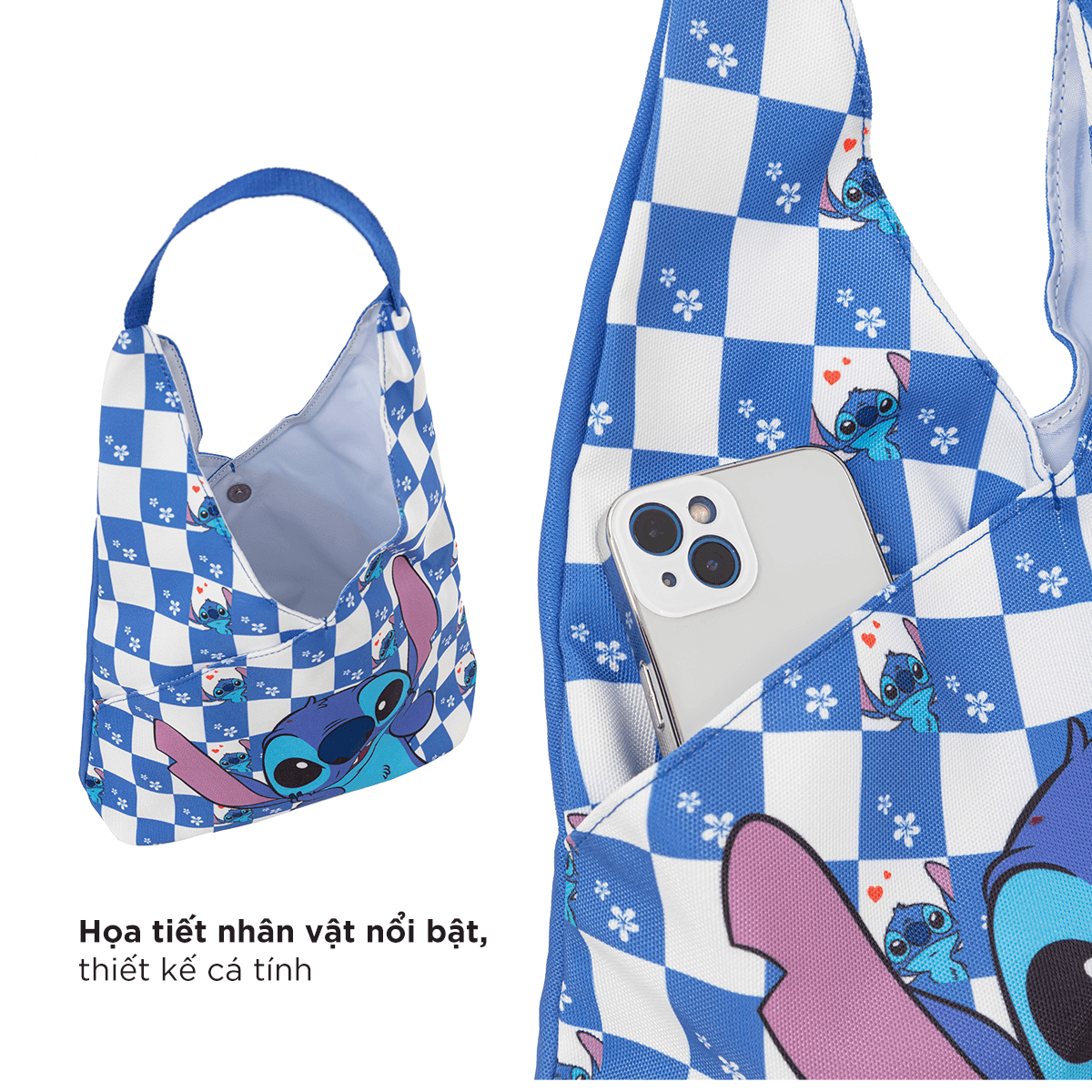 Điểm nhấn đặc biệt của chiếc túi này chính là hình nhân vật Stitch được in ấn tỉ mỉ bên ngoài. Hình ảnh Stitch đáng yêu được thiết kế một cách độc đáo, thể hiện cá tính riêng và nổi bật.