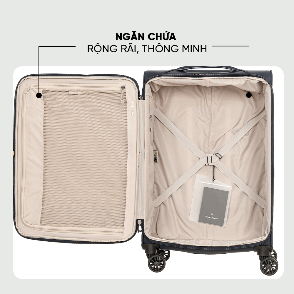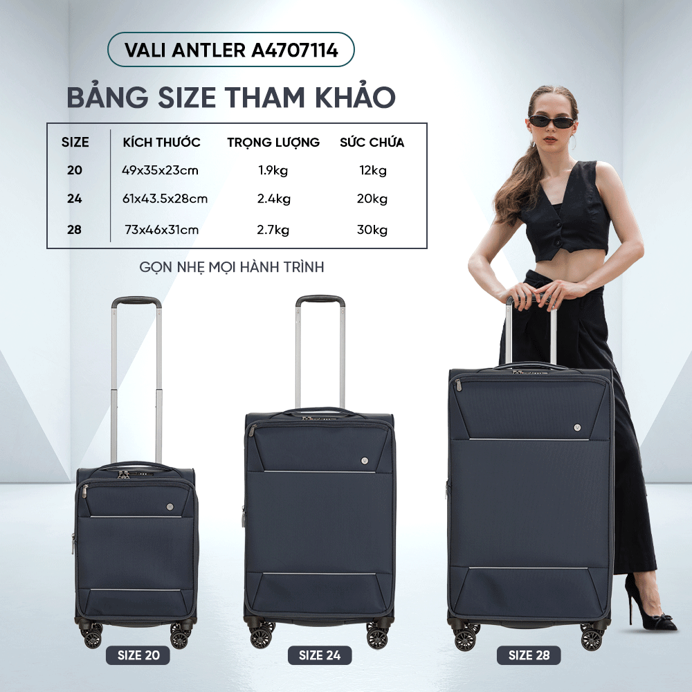 Vali Antler A4707114 với diện mạo vuông vức và tối giản các chi tiết cầu kỳ, tạo nên một cảm giác mới lạ và thanh lịch. Cách sử dụng gam màu đơn sắc nhã nhặn, tạo nên sự thanh lịch và quý phái chuẩn người thành đạt. Đây là một trong những mẫu vali vải có trọng lượng siêu nhẹ (chưa đến 2kg đối với size 20), giúp bạn tối ưu được hành lý chứa đựng.