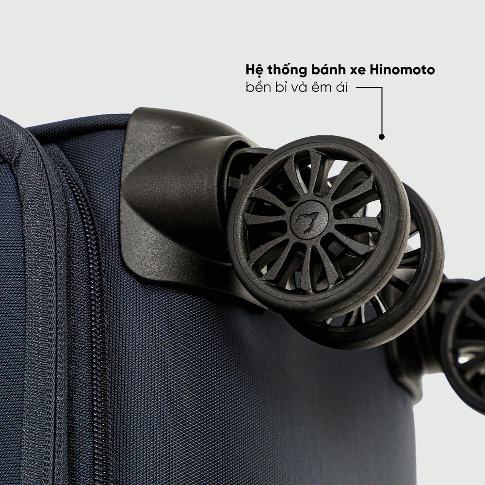 Vỏ bánh xe vali A4707114 làm bằng cao su thiên nhiên đúc nguyên khối, bọc quanh khung nhựa cứng có lỗi cốt thép đặc bên trong, hạn chế ma sát với mặt đường, hỗ trợ điều hướng vali, giúp di chuyển sản phẩm êm ái, không gây tiếng ồn. Tất cả đều tích hợp trong chiếc bánh xe bé nhỏ được sản xuất bởi nhà máy Hinomoto (Nhật Bản).