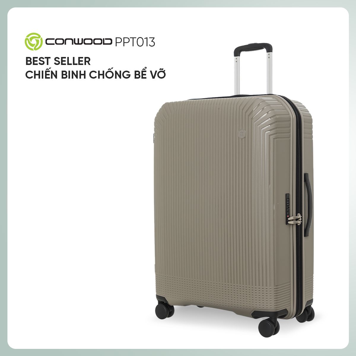 Conwood PPT013 nổi bật với chất liệu nhựa PP siêu bền, khả năng chịu lực gấp nhiều lần nhựa thông thường, gần như “bất khả chiến bại” trước va đập. Thiết kế hiện đại, đường nét cứng cáp nhưng vẫn tinh tế, phù hợp cho cả du lịch và công tác dài ngày.