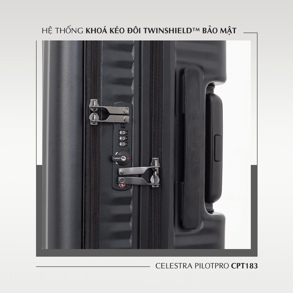 Vali Echolac Celestra PilotPRO CPT183 được trang bị hệ thống khóa số TSA theo chuẩn Quốc Tế, đảm bảo an toàn cho hành lý tối ưu. Đặc biệt, bộ khóa còn hỗ trợ cho bạn trong các chuyến đi Quốc Tế cần thiết kiểm tra hành lý gấp mà không cần đến chìa khóa, tiện lợi và tiết kiệm thời gian chờ tối đa cho bạn.