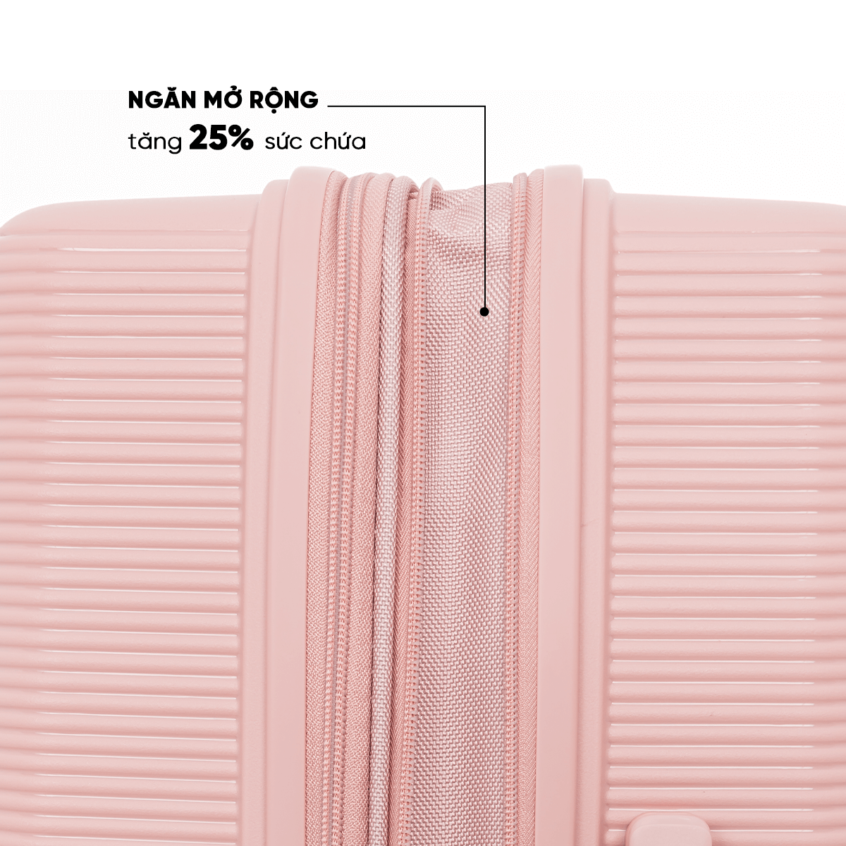 Thiết kế thông minh với ngăn mở rộng linh hoạt giúp tăng không gian chứa đồ lên đến 25%, hỗ trợ bạn mang theo thêm hành lý khi cần thiết mà không phải sử dụng thêm vali khác.