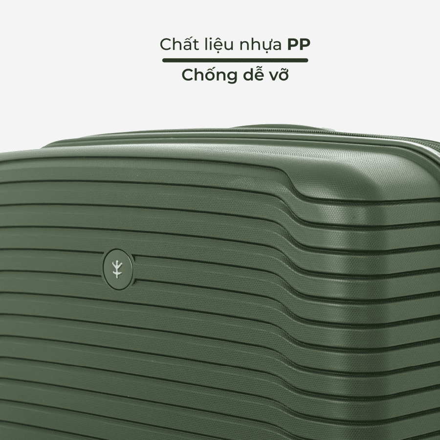 Thân vali được làm từ nhựa PP cao cấp, nổi bật với khả năng chống va đập, chống bể vỡ và chịu lực tốt. Đây là loại vật liệu lý tưởng giúp bảo vệ hành lý an toàn trong mọi điều kiện vận chuyển, kể cả ký gửi hàng không.
