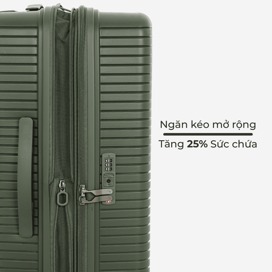 Vali được thiết kế thêm một ngăn mở rộng thông minh, giúp tăng sức chứa lên đến 25%. Tính năng này đặc biệt hữu ích trong các chuyến đi dài hoặc khi bạn cần linh hoạt thêm chỗ cho quà tặng, đồ dùng cá nhân mà không cần phải mang thêm túi xách phụ.