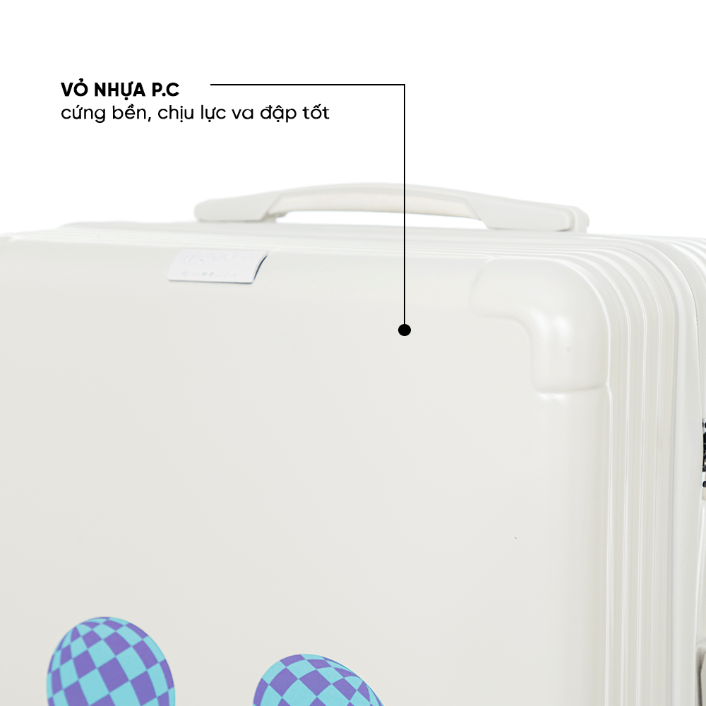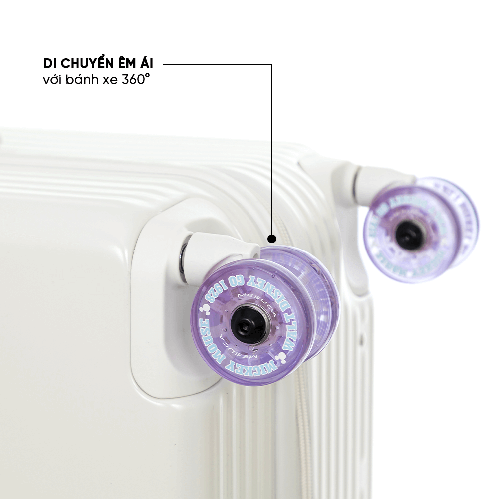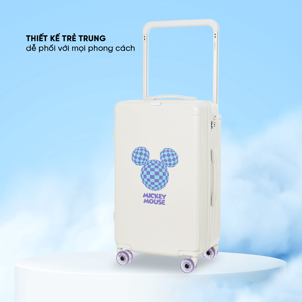 Bề mặt tông sáng điểm hình đầu Mickey caro tím xanh tạo hiệu ứng thị giác bắt mắt. Tổng thể vuông vức, đường gân dọc hiện đại giúp vali vừa thời trang vừa cứng cáp, phù hợp từ outfit năng động đến thanh lịch.