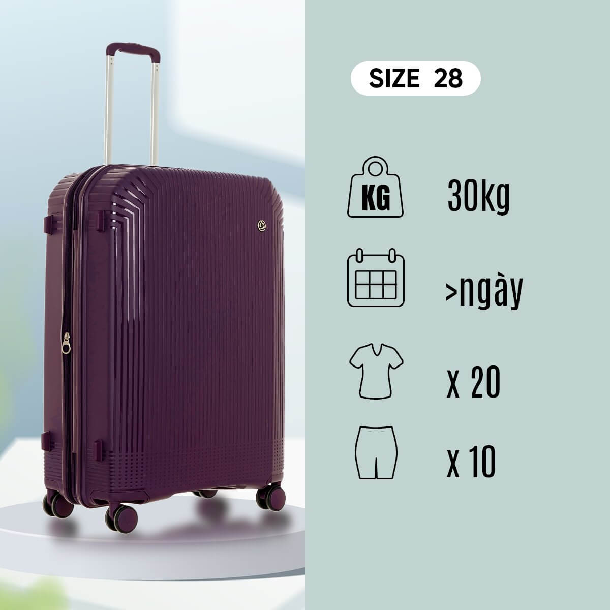Chiếc vali này là lựa chọn hoàn hảo cho những ai muốn gói gọn mọi đồ dùng cần thiết vào một kiện duy nhất khi đi du học. Với kích thước 28 inch, khoảng 67x51x29cm, vali size 28 có thể chứa từ 30kg hành lý.