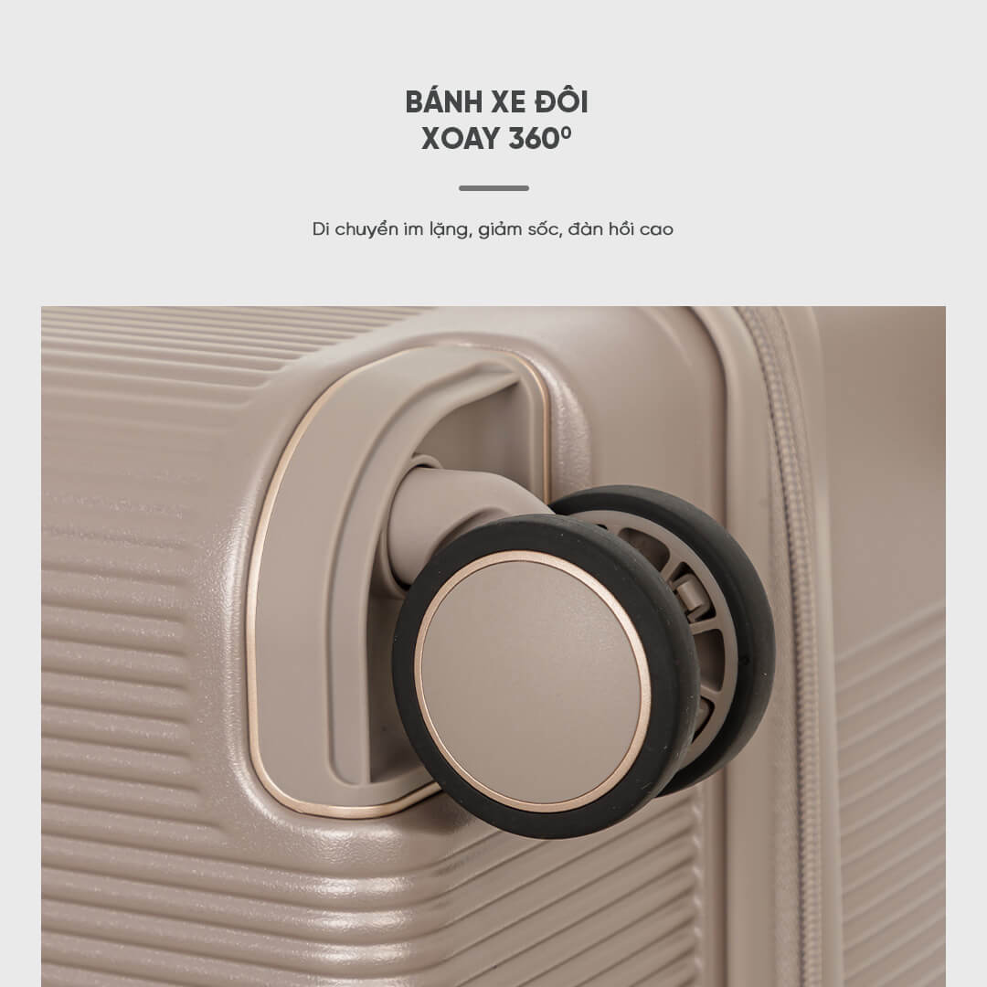 Hệ thống bánh xe đôi xoay 360° giúp di chuyển nhẹ nhàng, êm ái trên mọi bề mặt. Thiết kế chịu lực tốt, giảm tiếng ồn, giúp hành trình của bạn trở nên dễ dàng hơn.