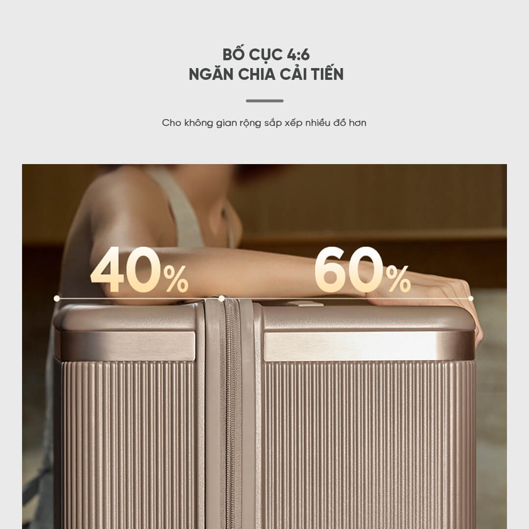 Không gian lưu trữ thông minh với tỉ lệ 4:6 giúp tối ưu khả năng sắp xếp đồ đạc. Bố cục này mang đến sự linh hoạt, dễ dàng phân loại hành lý theo nhu cầu sử dụng.
