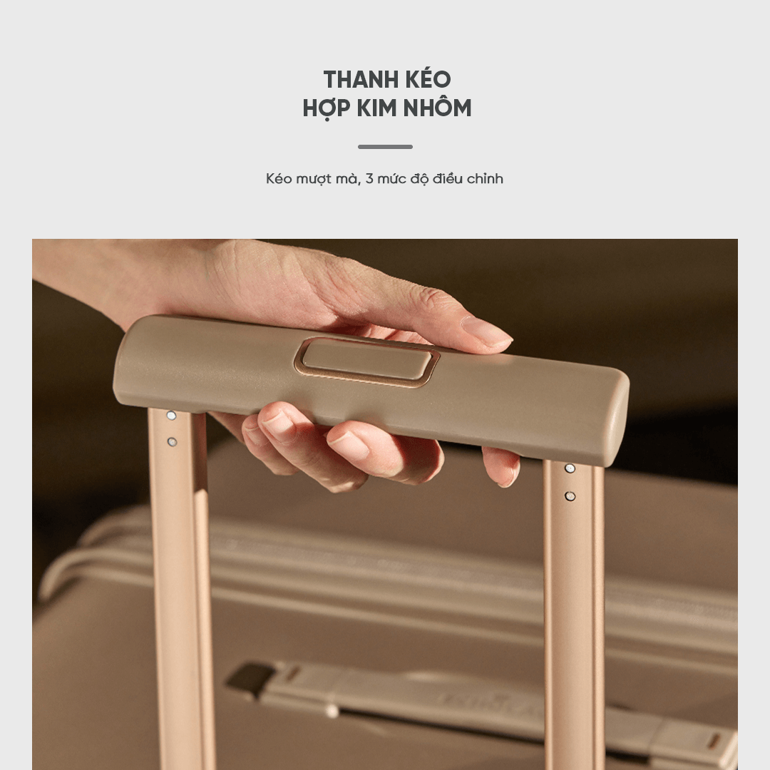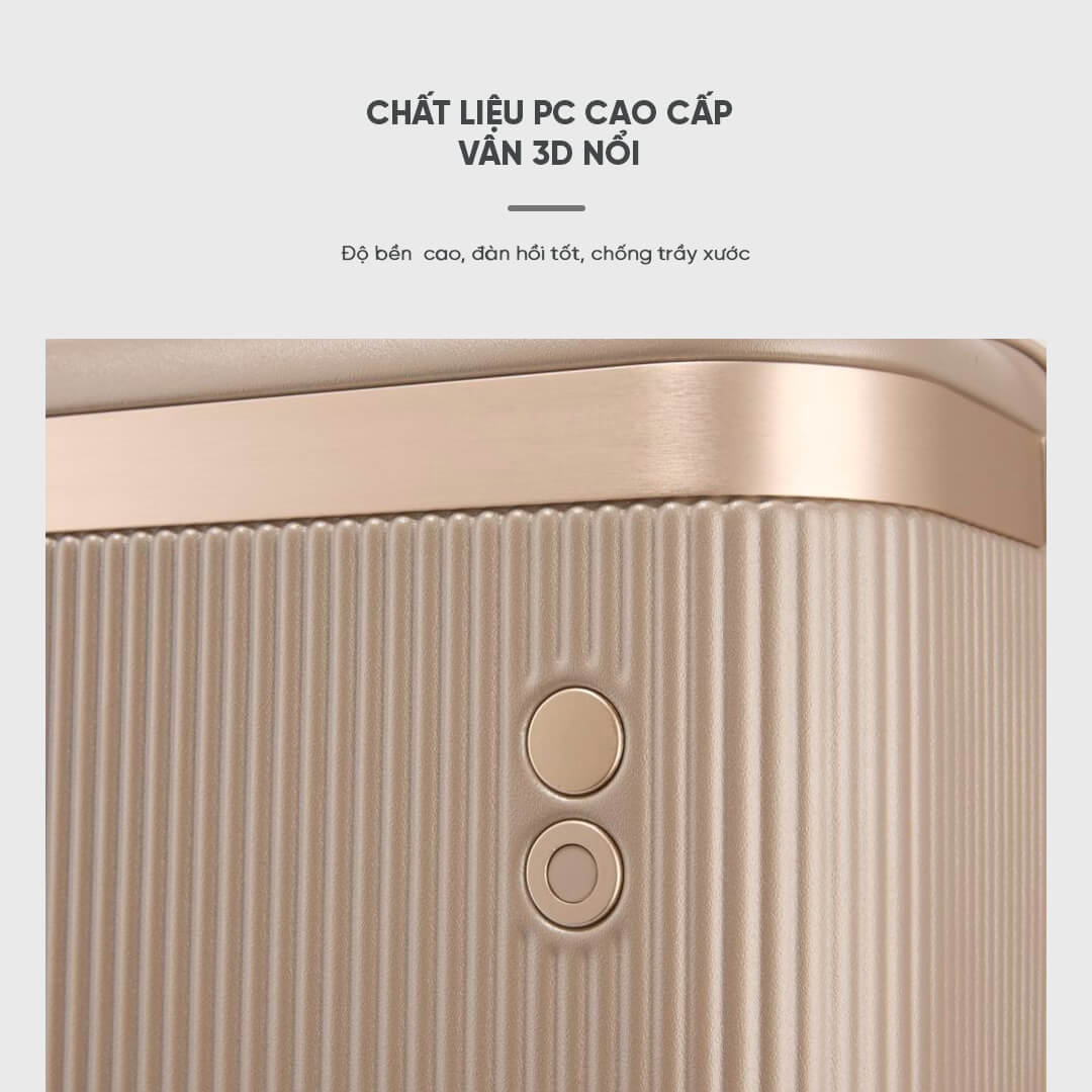 Thân vali được làm từ 100% Polycarbonate cao cấp, kết hợp bề mặt vân 3D nổi, giúp chống trầy xước và tăng độ bền bỉ. Thiết kế này không chỉ chắc chắn mà còn mang lại vẻ đẹp thời thượng.