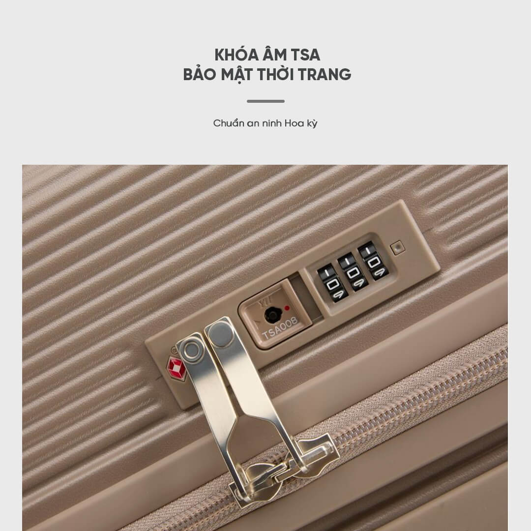 Khóa TSA tiêu chuẩn Hoa Kỳ được thiết kế âm chìm, giúp tăng tính thẩm mỹ và đảm bảo an toàn tối đa. Với cơ chế khóa hiện đại, bạn có thể yên tâm bảo vệ hành lý của mình.
