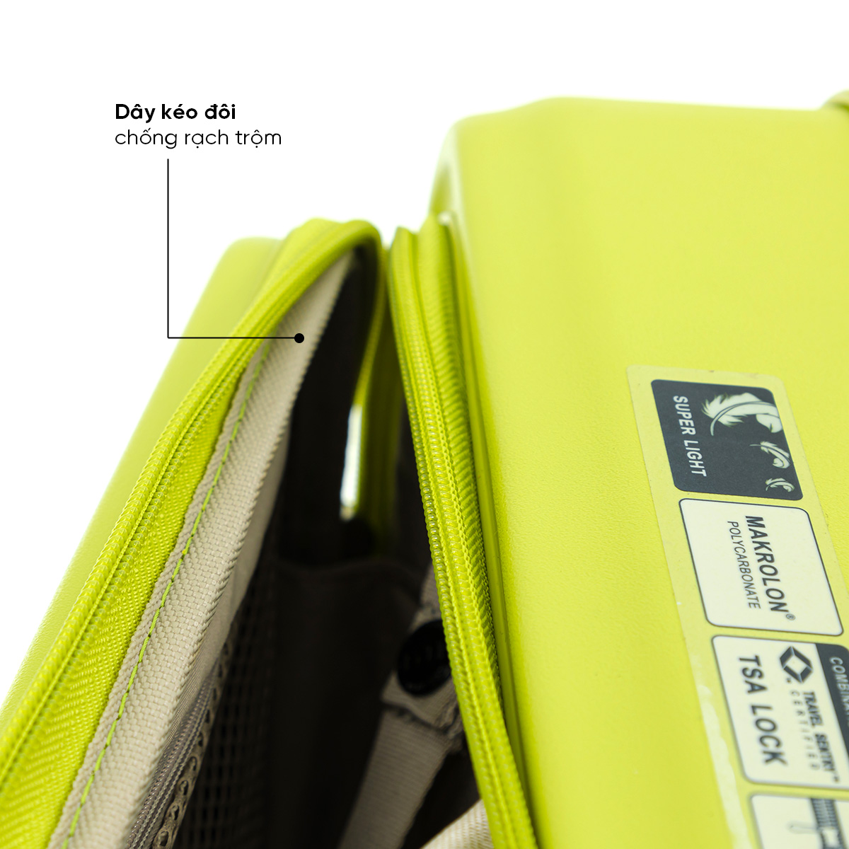 Toàn bộ vali được làm từ nhựa PC, một loại vật liệu siêu bền, chịu lực tốt, giúp bảo vệ tối đa đồ dùng bên trong. Chất liệu này còn có khả năng chống va đập, chống trầy xước hiệu quả, đảm bảo vali luôn bền đẹp theo thời gian.