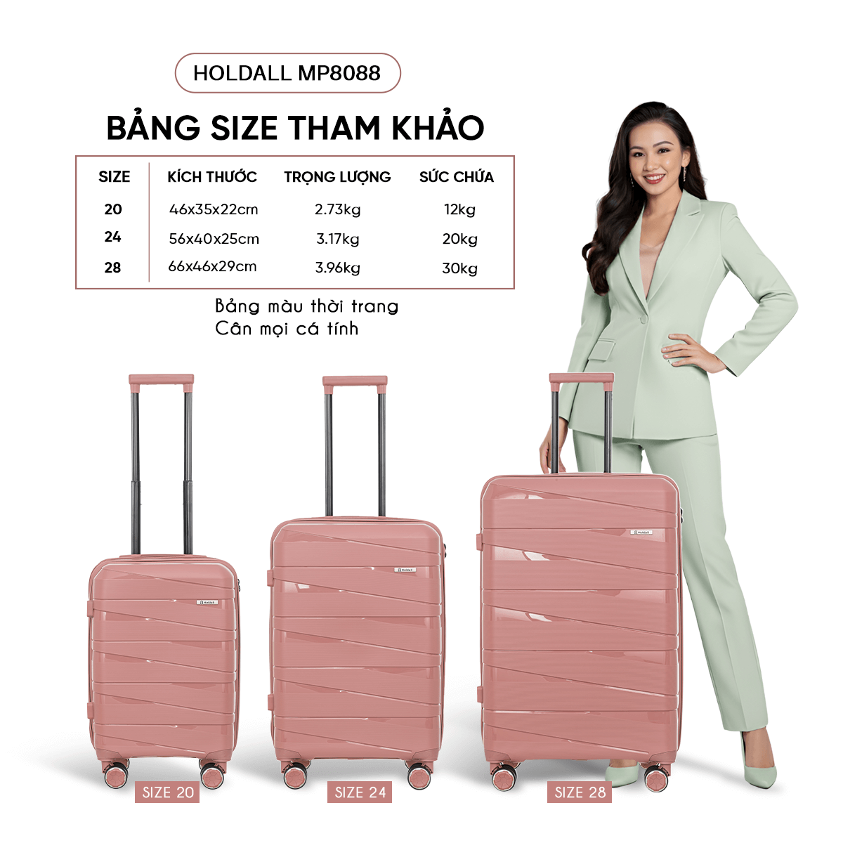 Holdall MP8088 là mẫu vali nhựa PP siêu bền, có thiết kế thời trang và tích hợp nhiều tính năng hiện đại để đáp ứng tốt nhất cho nhu cầu di chuyển của khách hàng.