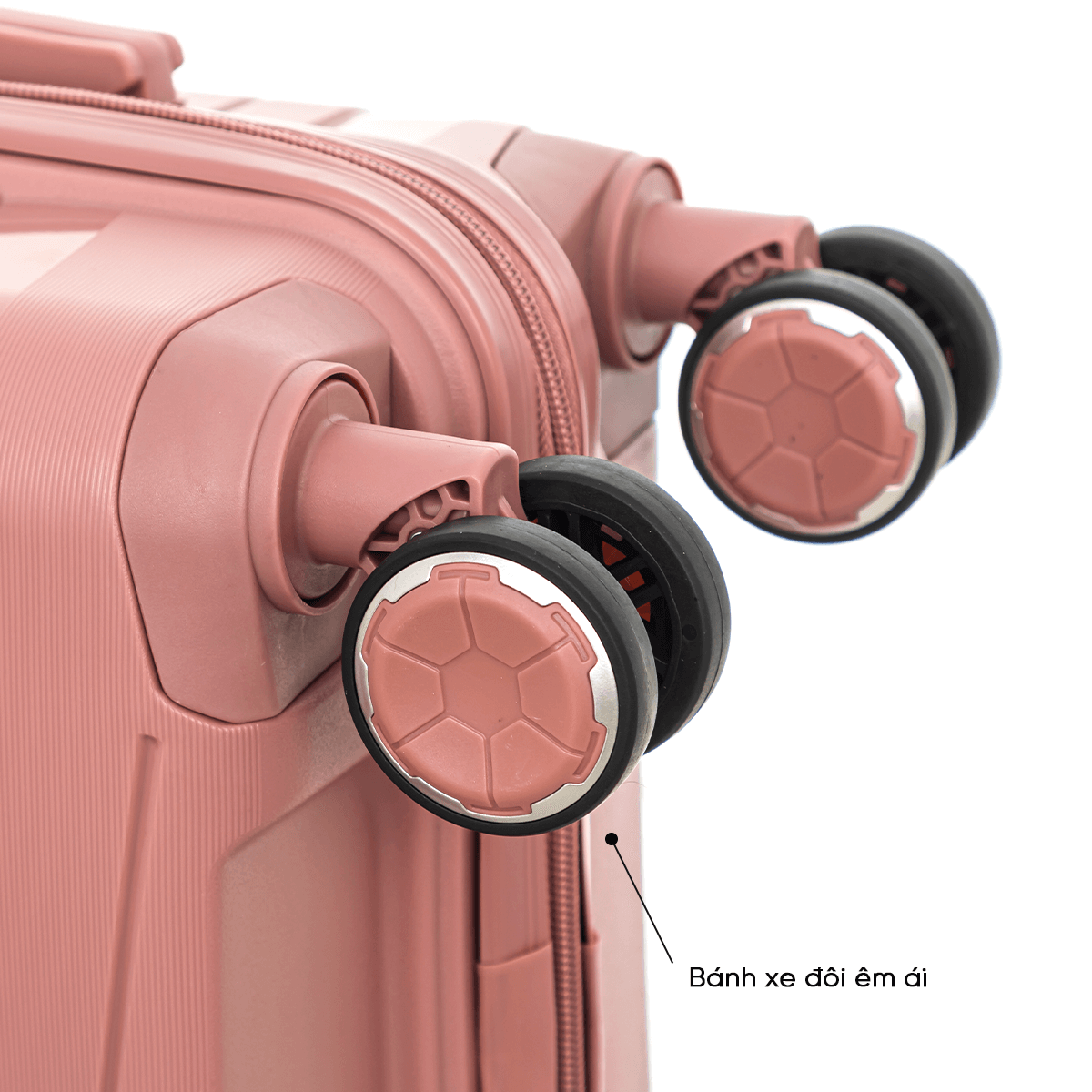 Hệ thống bánh xe đôi 360° giúp vali di chuyển ổn định, ít rung lắc và vận hành êm trên nhiều bề mặt. Mang lại trải nghiệm nhẹ nhàng và linh hoạt trong mọi chuyến đi.