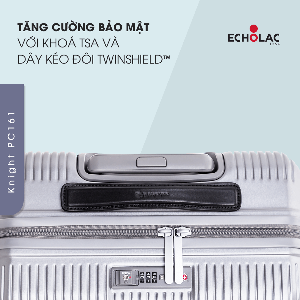 Vali Echolac Knight PC161 có trang bị tối ưu bảo mật với bộ dây kéo đôi TwinShield™ chống rạch trộm hiệu quả và hệ thống khóa số TSA chuẩn an ninh quốc tế, nhân đôi độ an toàn cho hành lý.