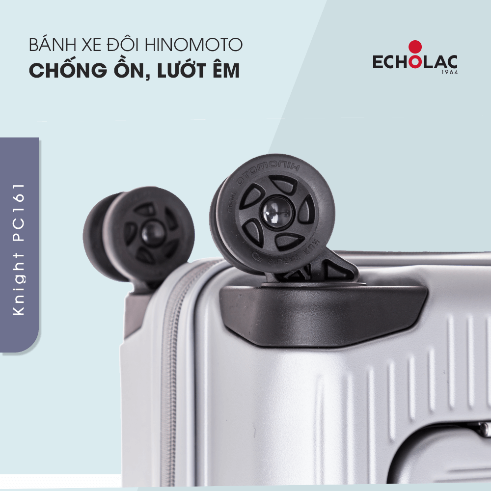 Vali Echolac Knight PC161 sở hữu bánh xe đôi cao cấp Hinomoto với lớp bọc cao su non cao cấp, vượt trội với khả năng chống ồn tối ưu. Ngoài ra, lớp cao su non này còn giúp bánh xe có khả năng giảm sốc cho hành lý và lướt êm trên mọi địa hình.