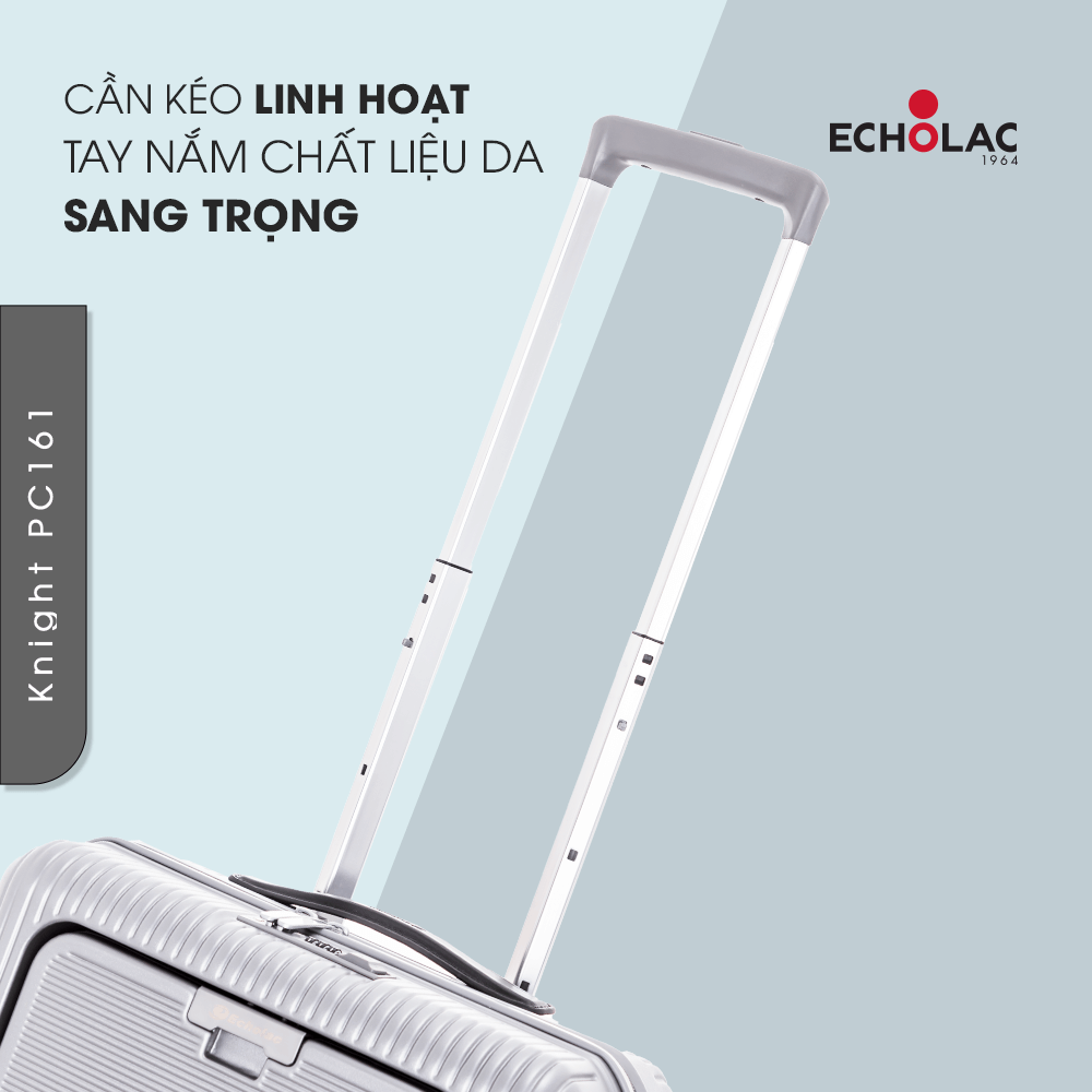 Vali Echolac Knight PC161 được trang bị hệ thống cần kéo EcholacSelectErgoStop™ vượt trội với khả năng điều chỉnh độ cao tối ưu, gần như thích hợp với mọi chiều cao của người sử dụng. Ngoài ra, tay nắm của vali được thiết kế bằng da vừa vặn tay nắm và đặc biệt sang trọng khi sử dụng.