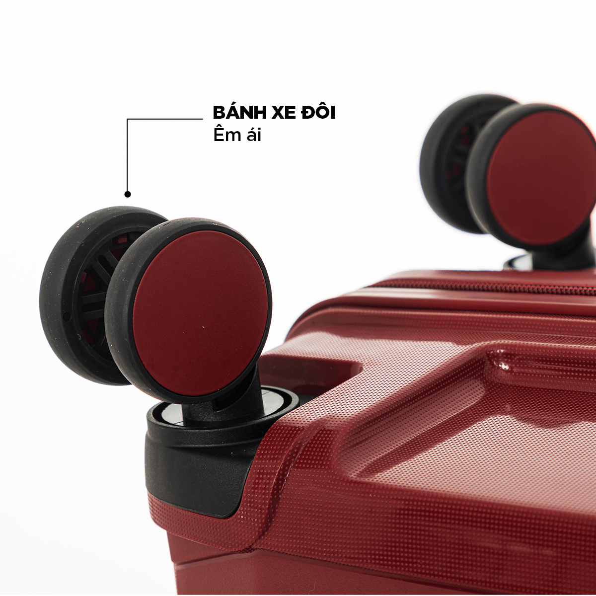 Hệ thống bánh xe đôi mang lại độ êm ái rõ rệt khi di chuyển, kể cả trên mặt đường không bằng phẳng. Khả năng xoay 360° giúp bạn điều khiển vali nhẹ nhàng và ít tốn lực hơn.