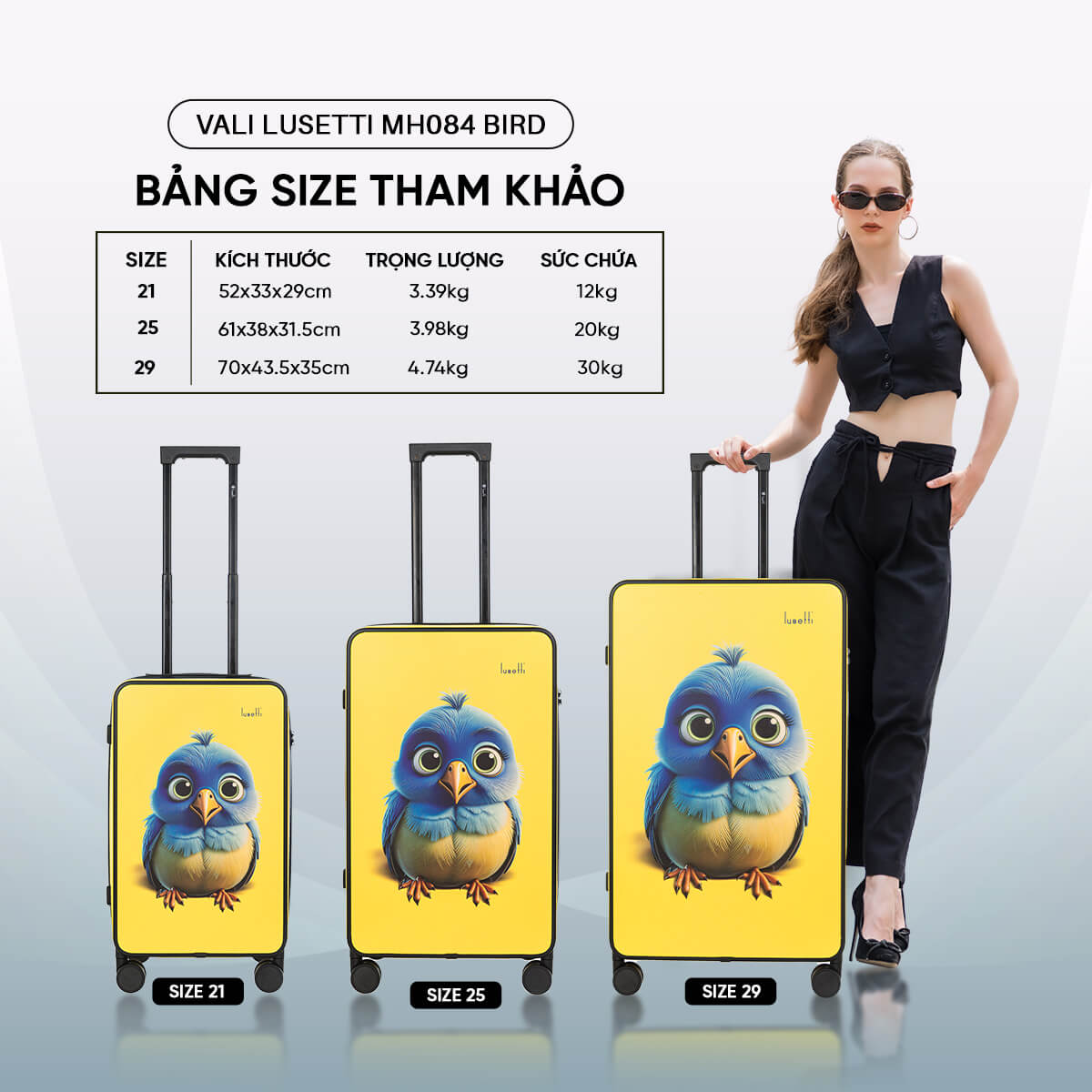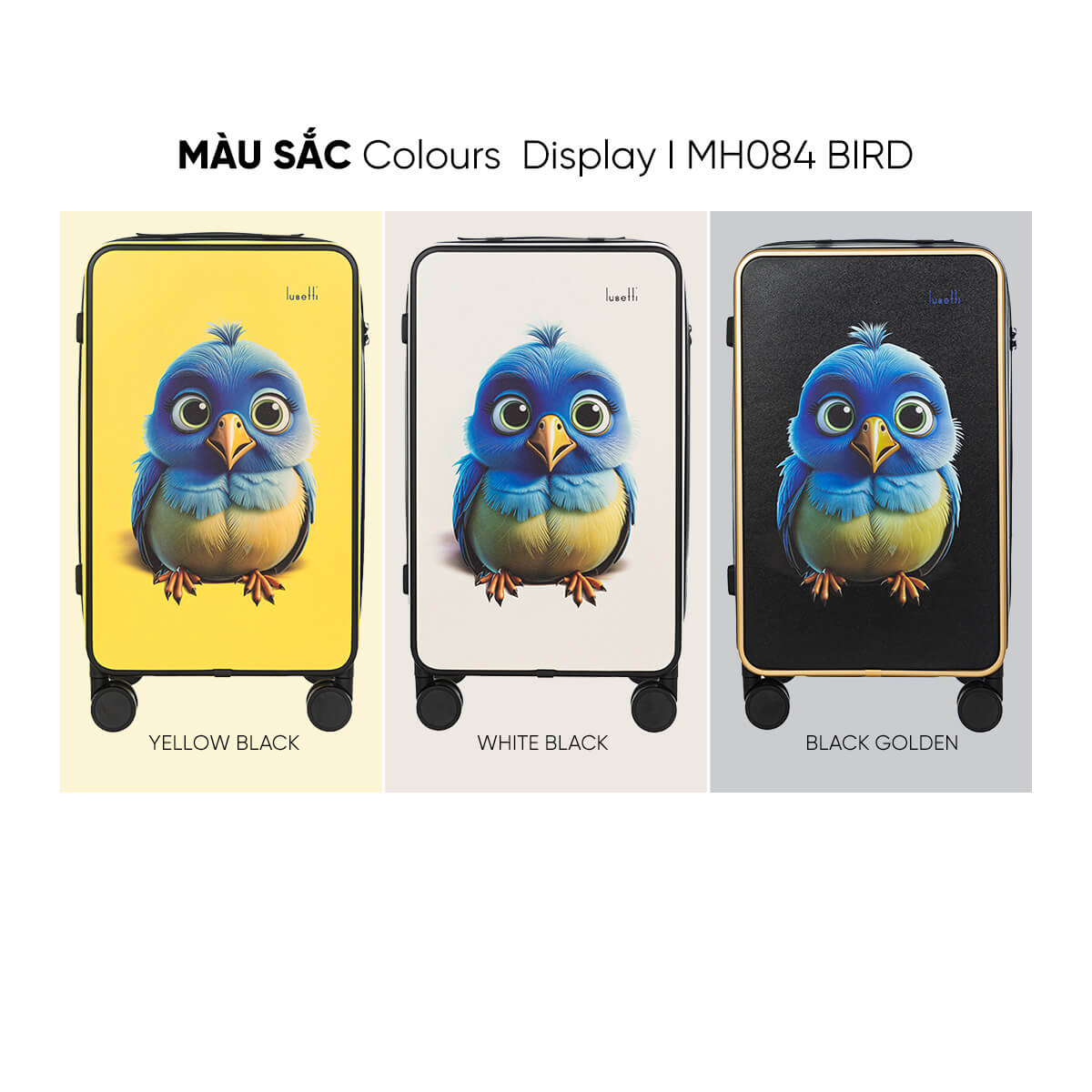 Nếu bạn đang tìm kiếm một chiếc vali vừa bền bỉ, vừa nổi bật giữa đám đông thì Lusetti MH084 BIRD chính là lựa chọn hoàn hảo. Thiết kế độc đáo với hình chú chim dễ thương mang lại cảm giác tươi vui, trẻ trung, phù hợp cho cả những chuyến du lịch ngắn ngày hay hành trình dài.