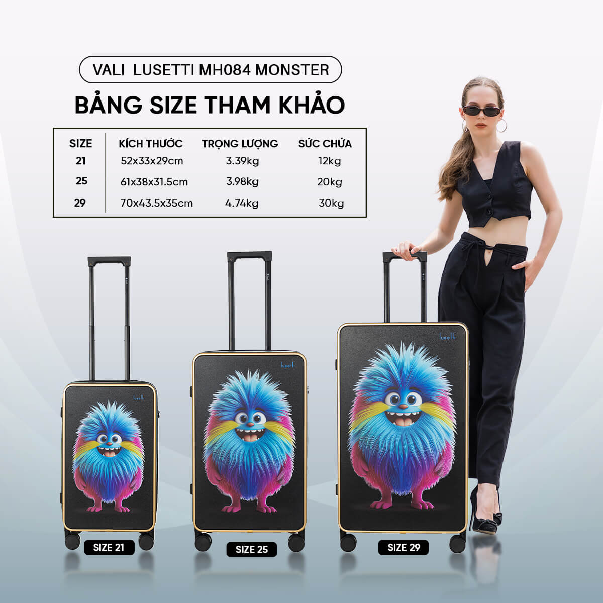 Mang đến tinh thần trẻ trung và rực rỡ, vali Lusetti MH084 MONSTER gây ấn tượng với bảng màu tươi sáng cùng hình ảnh nhân vật Monster vui nhộn. Thiết kế mang hơi thở hiện đại và năng lượng tích cực, chiếc vali này là lựa chọn lý tưởng cho những ai yêu thích phong cách cá tính và tràn đầy sức sống trong mỗi chuyến đi.