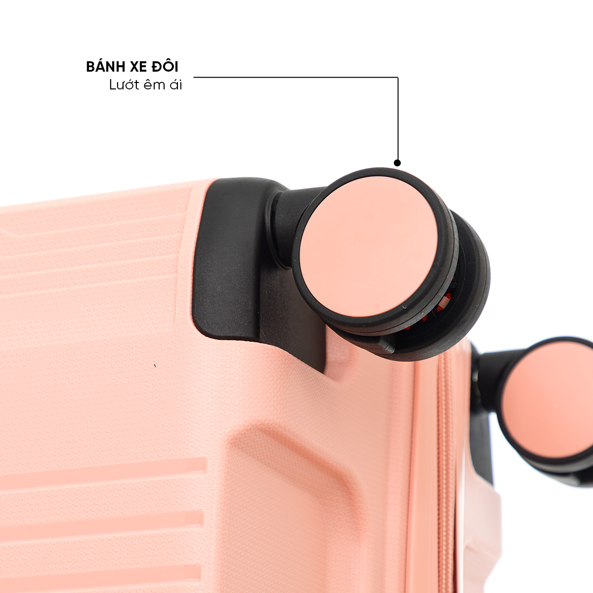 Hệ thống bánh xe đôi xoay 360 độ giúp vali di chuyển mượt mà trên nhiều bề mặt, giảm tiếng ồn và hạn chế ma sát tối đa.