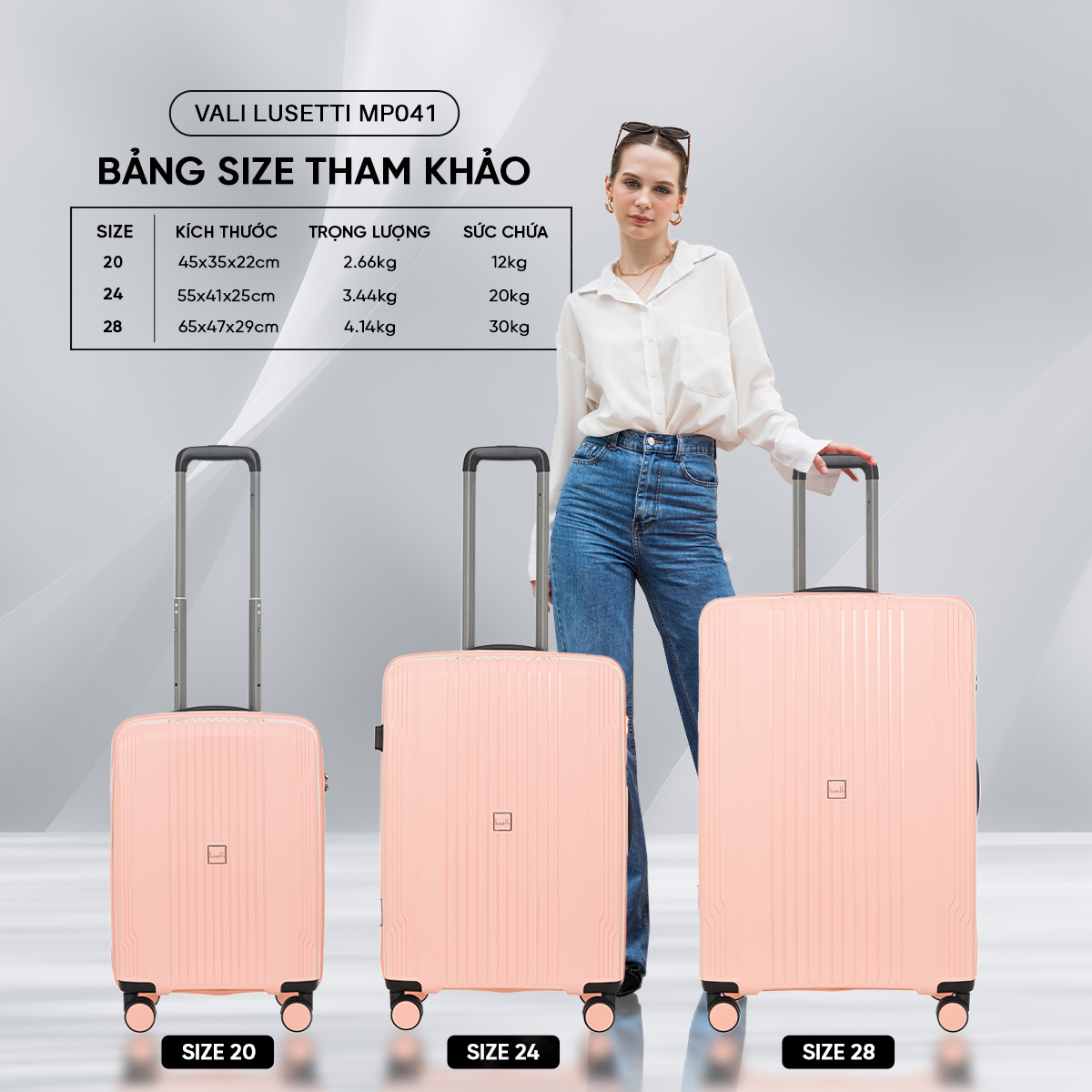 Vali Lusetti MP041 vệ thần mới gia nhập “team” vali chống vỡ bền bỉ của LUG. Nếu bạn đang tìm kiếm một item hành lý tối giản tiện ích nhưng không kém phần bền bỉ thì MP041 chính là một lựa chọn lý tưởng. Với chất liệu cao cấp cùng cấu trúc vững chắc, MP041 sẵn sàng đồng hành cùng bạn trên mọi chặng đường.