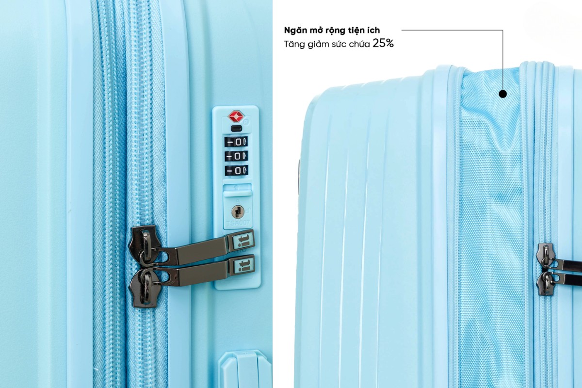 - Khi cần đóng thêm đồ, chỉ cần kéo khóa mở ngăn tăng size, vali sẽ nới rộng theo chiều sâu, giúp bạn thêm không gian chứa đồ mà không cần đổi vali to hơn.