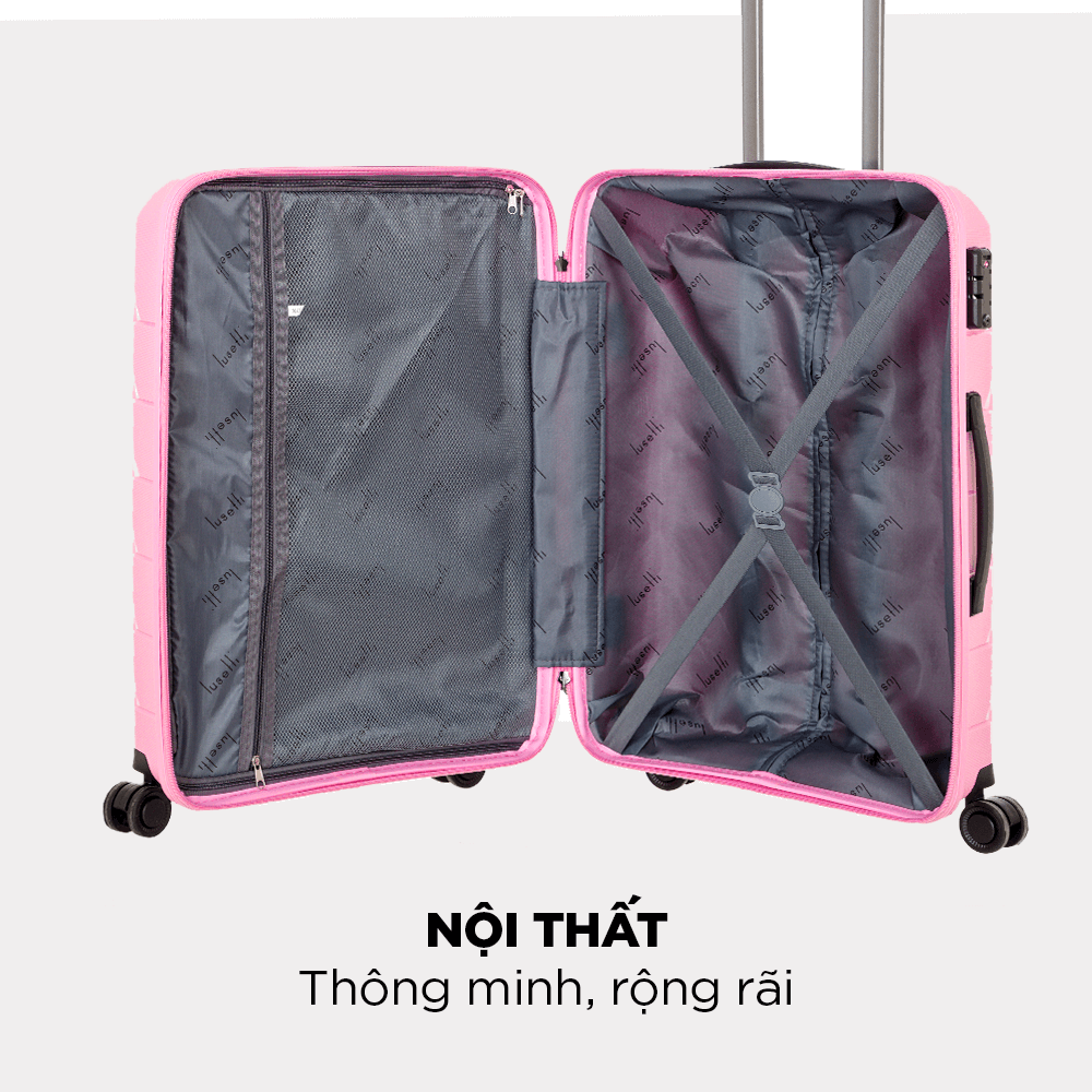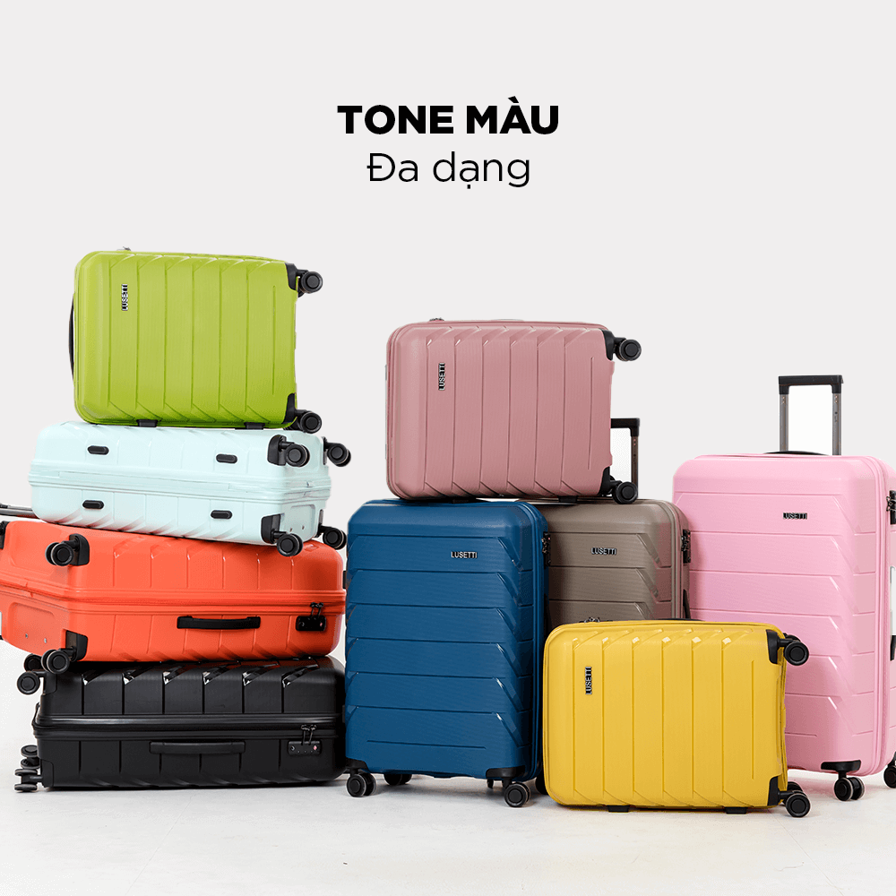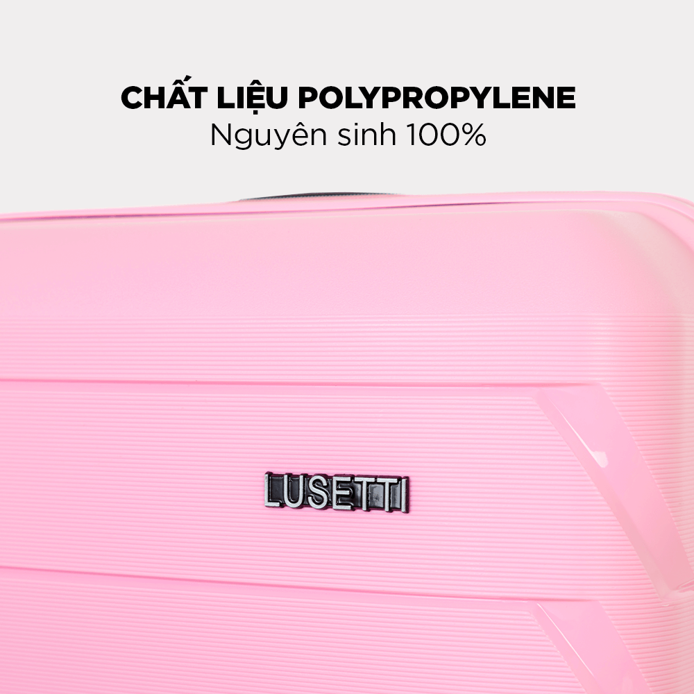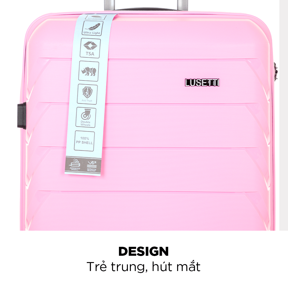 Với các thiết kế tiên tiến hiện đại trên các mặt vân 3D được đặt liên kết trải dài toàn thân để thu hút ánh nhìn. Logo Lusetti được sắp xếp theo góc phải làm nổi bật vừa vali nổi bật là một cách để tháo rời thương hiệu.