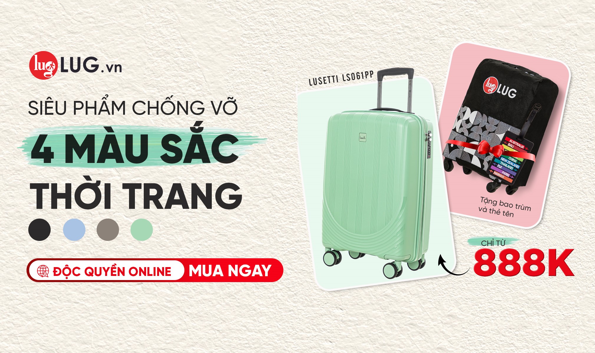 Lusetti LS061PP gây ấn tượng ngay từ cái nhìn đầu tiên với bảng màu pastel nhẹ nhàng, chuẩn gu thời trang Hàn Quốc mà giới trẻ yêu thích. Những tông màu dịu mắt giúp chiếc vali trông tinh tế, dễ phối outfit và đặc biệt “ăn ảnh” khi check-in sân bay.